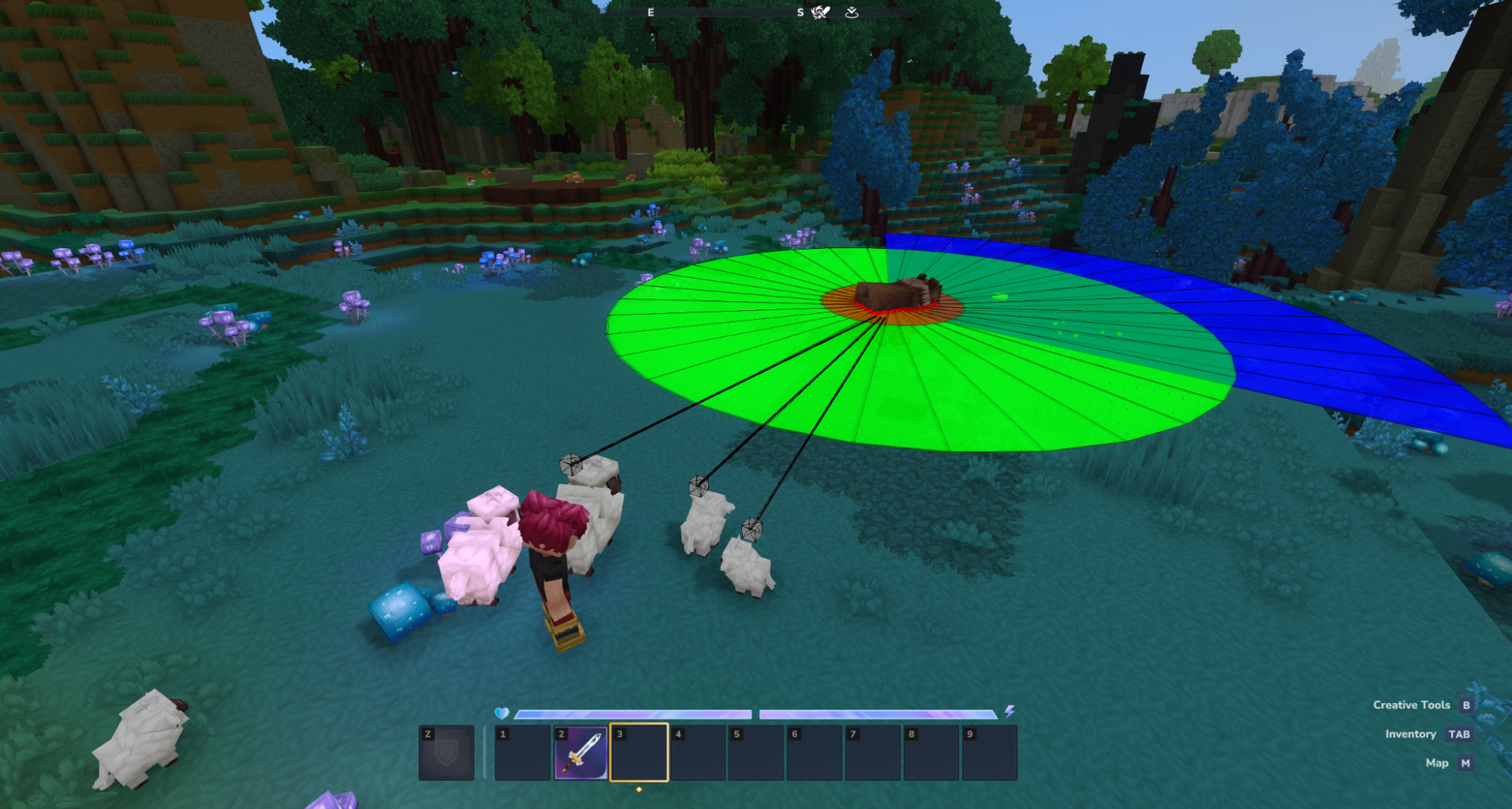 На першому скріншоті ведмідь спить і має лише один активний сенсор. На другому скріншоті ведмідь має слух, зір та абсолютний діапазон виявлення. Незважаючи на те, що вівці виявлені радіусом зору (у них є позначки цілі), вони знаходяться поза конусом огляду. Сім'я овець все ще в безпеці!